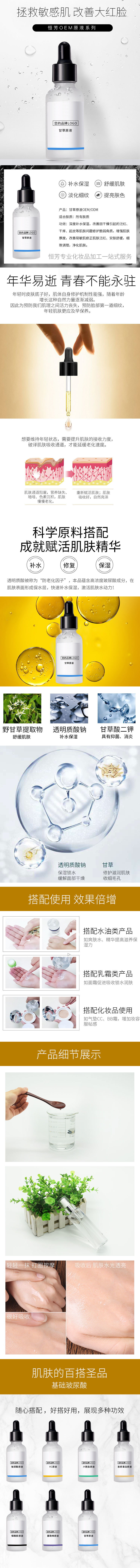 甘草精原液適用敏感性及已過敏皮膚,紅血絲皮質(zhì)層薄脆弱肌膚。精華液加工、精華液OEM由于年齡增長或遺傳因素造成免疫系統(tǒng)功能下降,隨之對外來的過敏原失去應(yīng)有的抵抗力,末稍神經(jīng)常處于緊張狀態(tài),有則充血紅腫,或出現(xiàn)頑固紅血絲,甘草精原液能有效鎮(zhèn)靜神經(jīng)系統(tǒng)增強(qiáng)免疫力,迅速舒緩過敏癥狀,強(qiáng)大的滲透力,保濕除皺,補(bǔ)水嫩白,修護(hù)受損細(xì)胞抗老化,增強(qiáng)肌膚彈性,使肌膚光滑、盈潤、透明充滿青春活力。